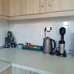Wyposażona kuchnia obejmuje czajnik elektryczny, lodówkę i przybory kuchenne, a także urządzenie do parzenia kawy/herbaty dla wygody gości.
